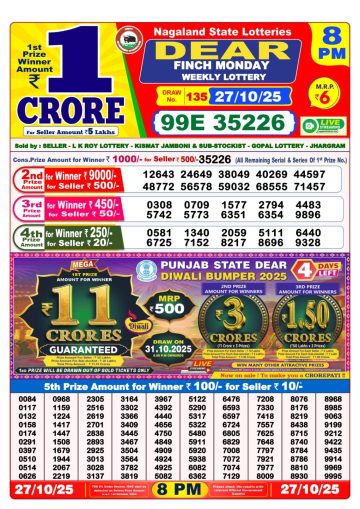 Dear Finch Monday Weekly Lottery 8 PM Result 27-10-25