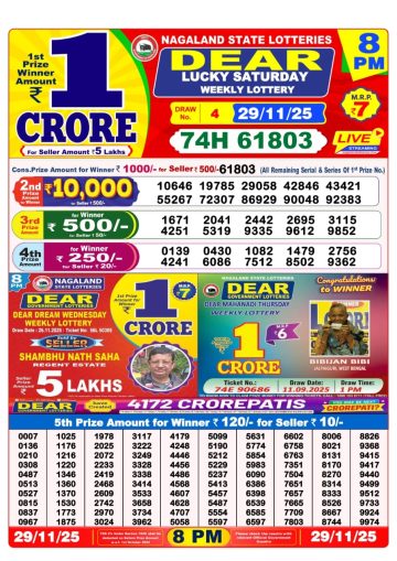 Dear Vision Saturday Weekly Lottery 1pm Result 29-11-25