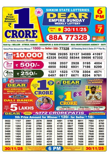 Dear Empire Sunday Weekly Lottery 6pm Result 30-11-25