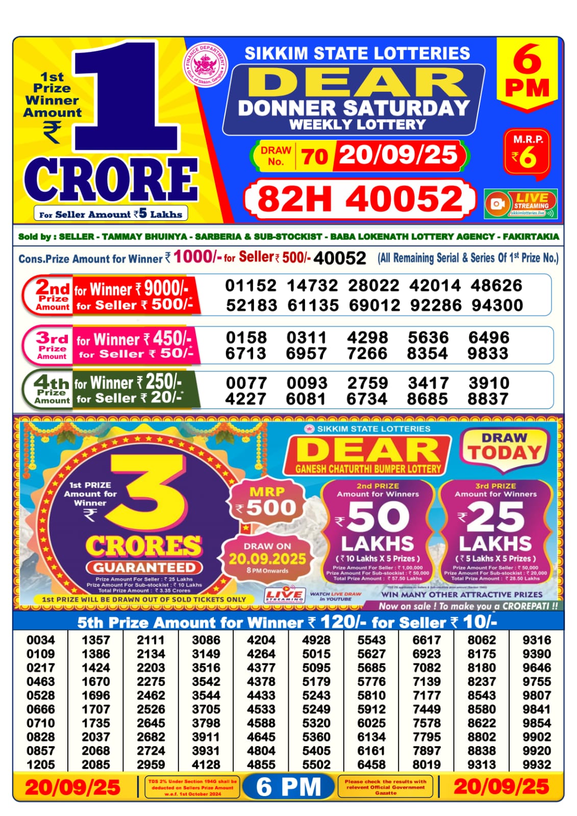 Dear Donner Saturday Weekly Lottery 6 PM Result 20-09-25