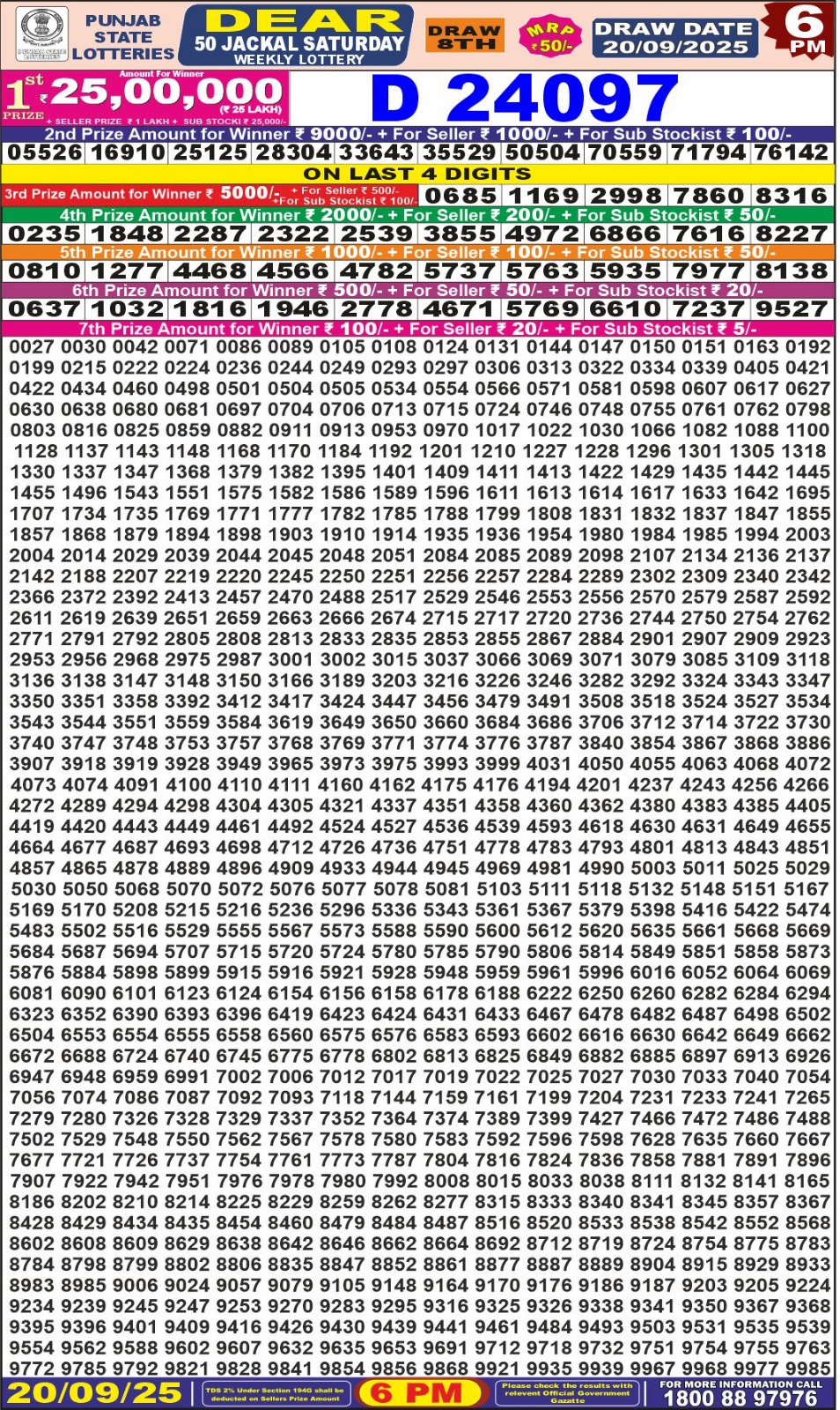 Punjab State Dear 50 Jackal Saturday Weekly Lottery 6 PM Result 20-09-25
