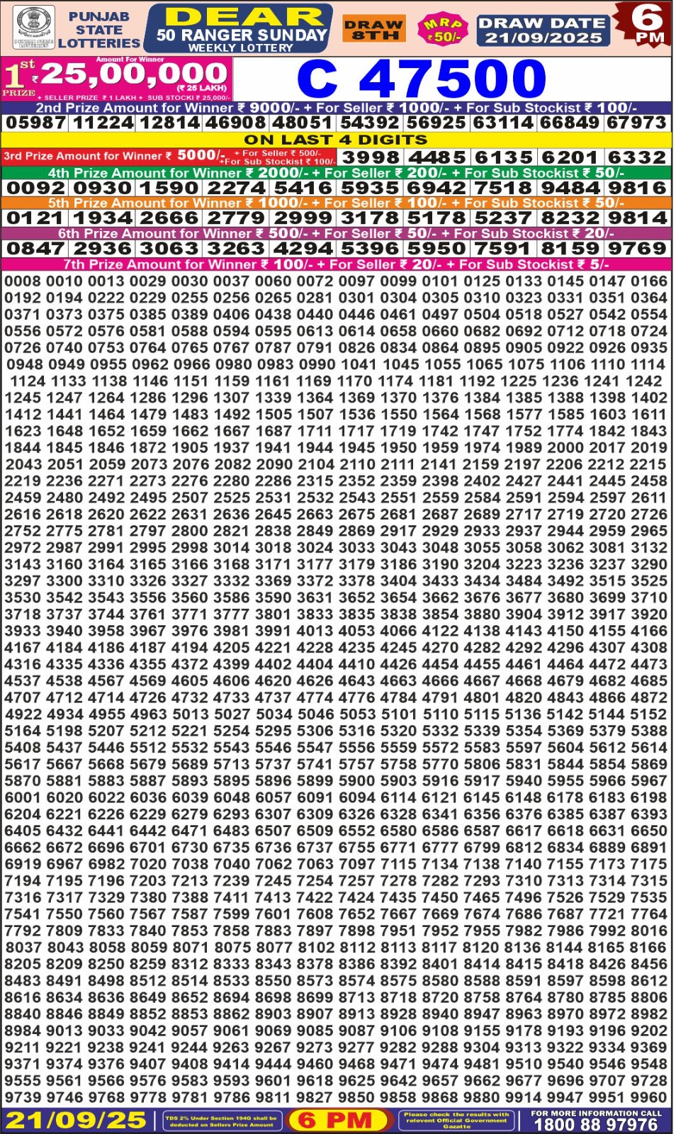 Punjab State Dear 50 Ranger Sunday Weekly Lottery 6 PM Result 21-09-25