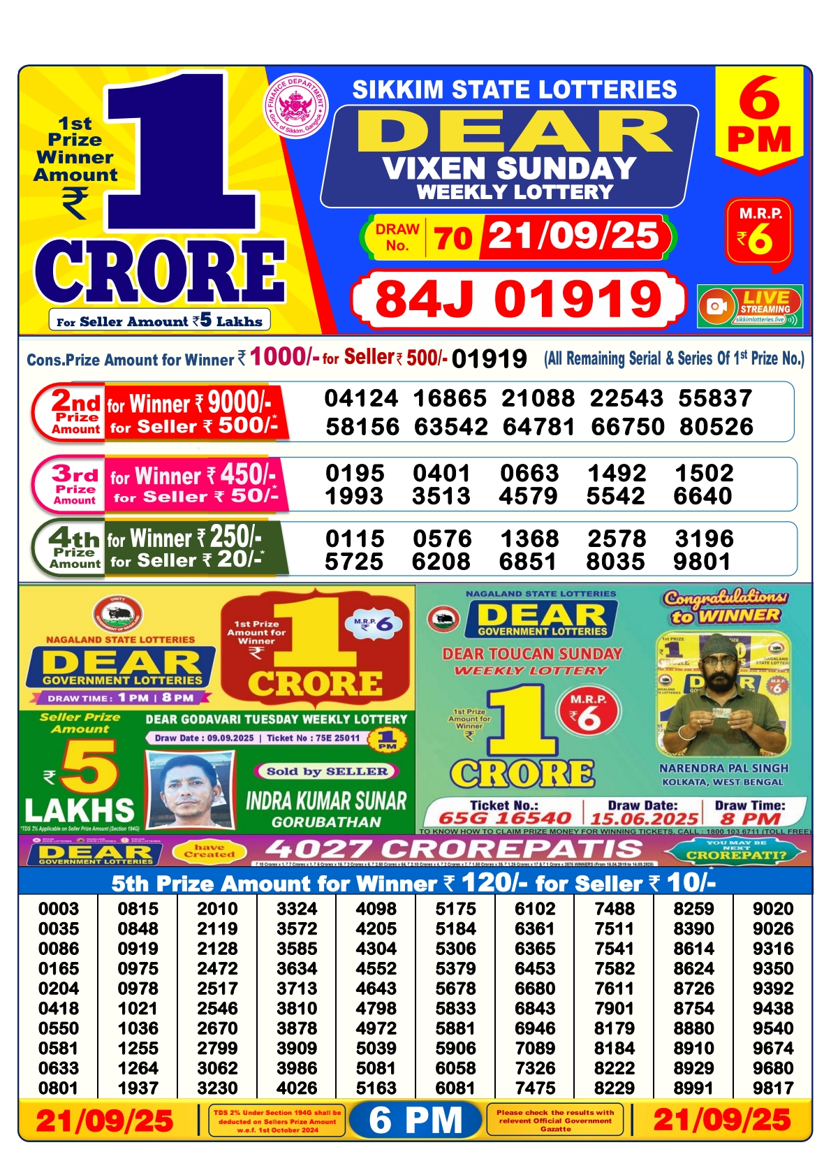 Dear Vixen Sunday Weekly Lottery 6 PM Result 21-09-25