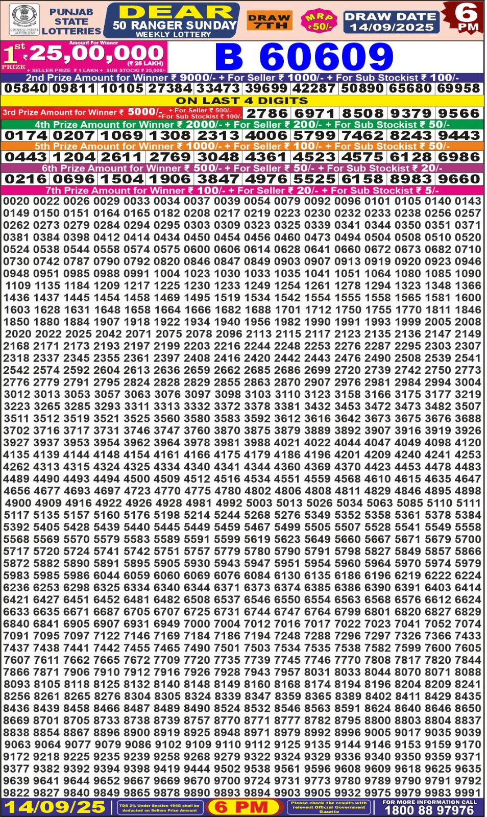 Punjab State Dear 50 Ranger Sunday Weekly Lottery 6 PM Result 14-09-25