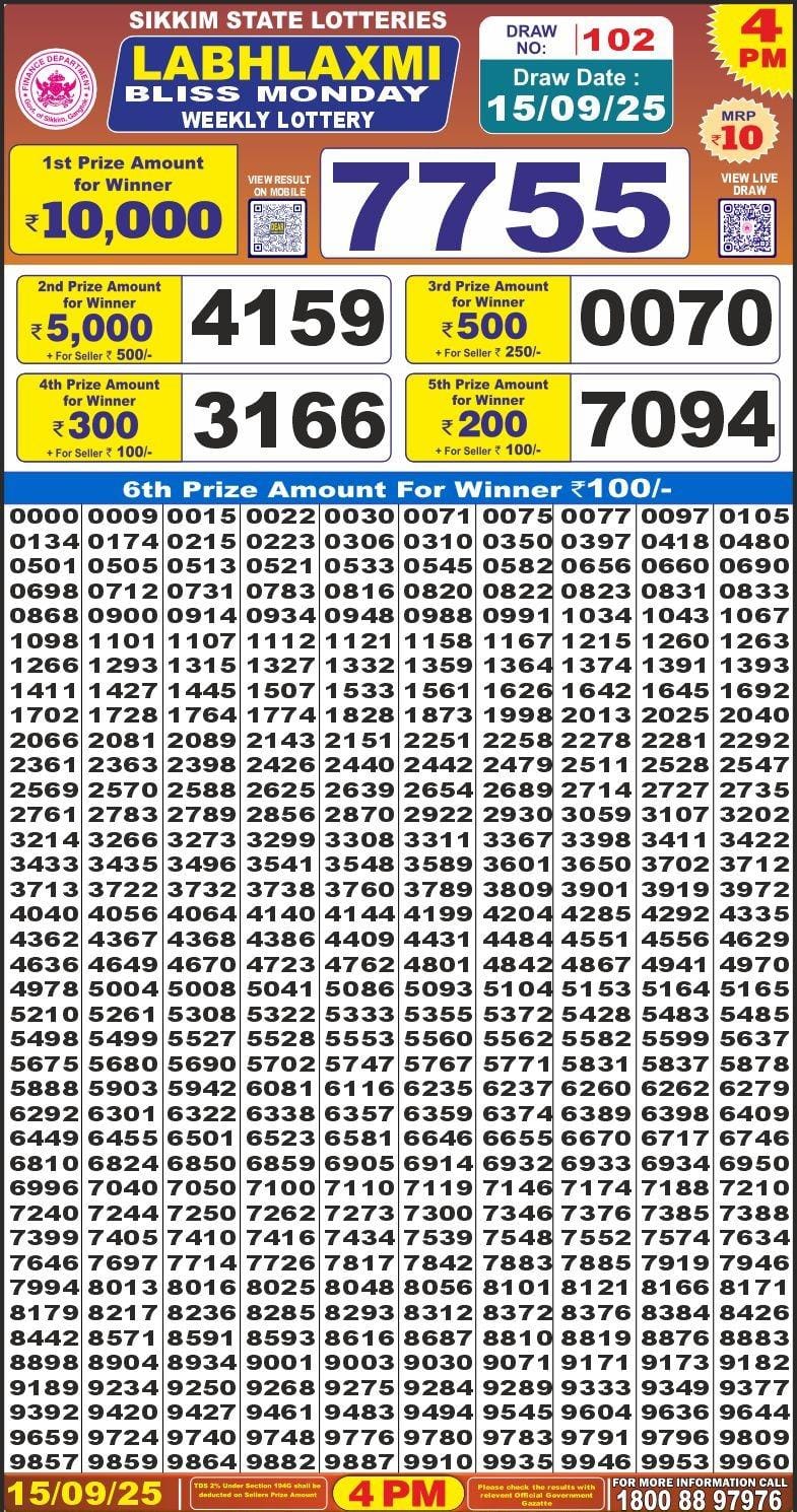 Labh Laxmi Bliss Monday Weekly Lottery 4 PM Result 15-09-25