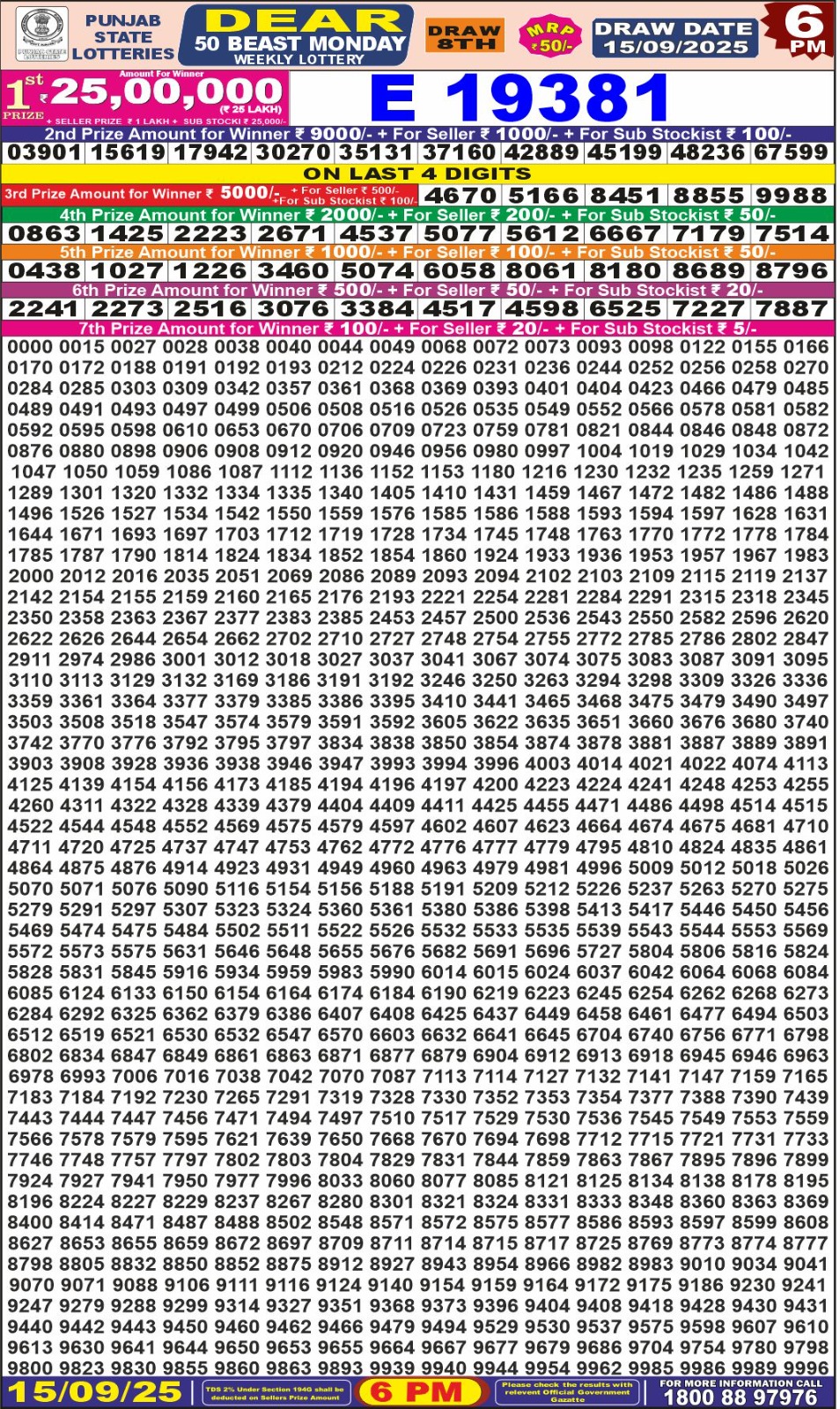Punjab State Dear 50 Beast Monday Weekly Lottery 15-09-25