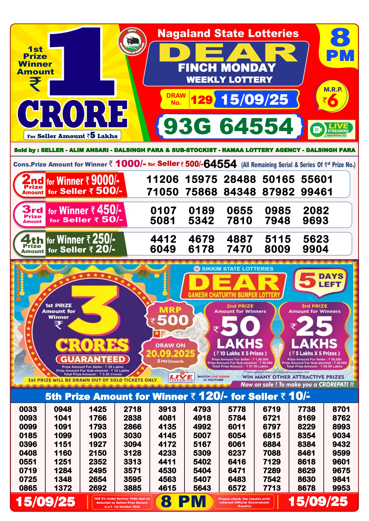 Dear Finch Monday Weekly Lottery 8 PM Result 15-09-25