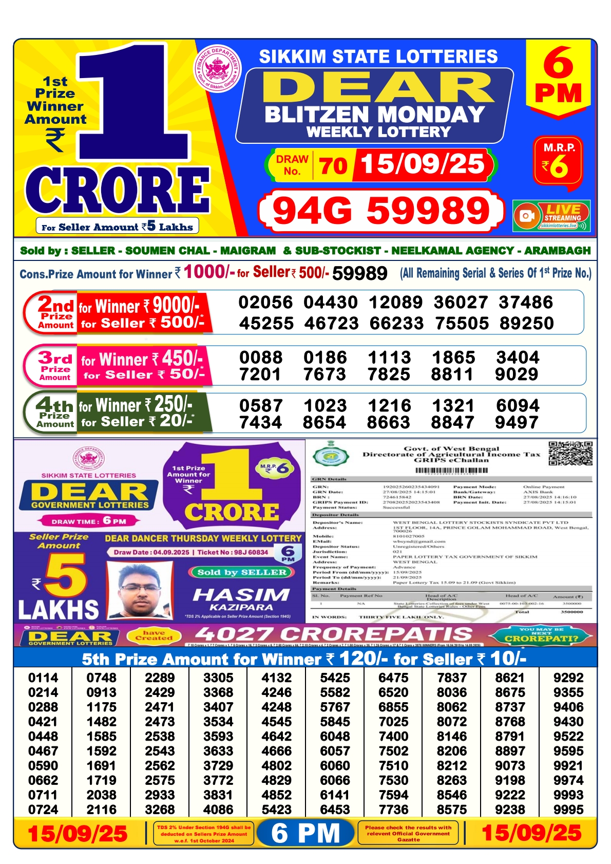 Dear Blitzen Monday Weekly Lottery 6 PM Result 15-09-25