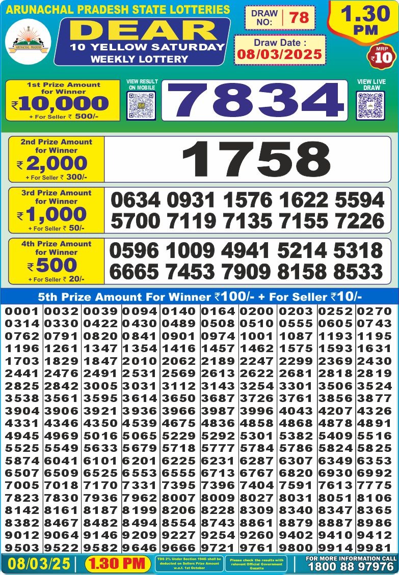 Dear 10 Yellow Saturday weekly lottery 1:30 pm result 8-3-25