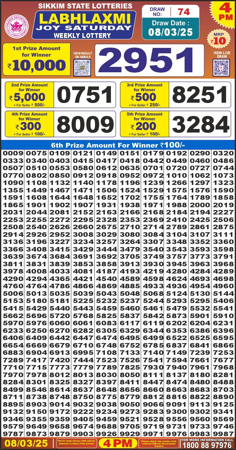 Labhlaxmi power sunday weekly lottery 4 pm result 9-3-25