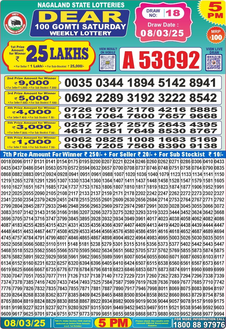 Dear 10 tough saturday weekly lottery 7 pm result 8-3-25