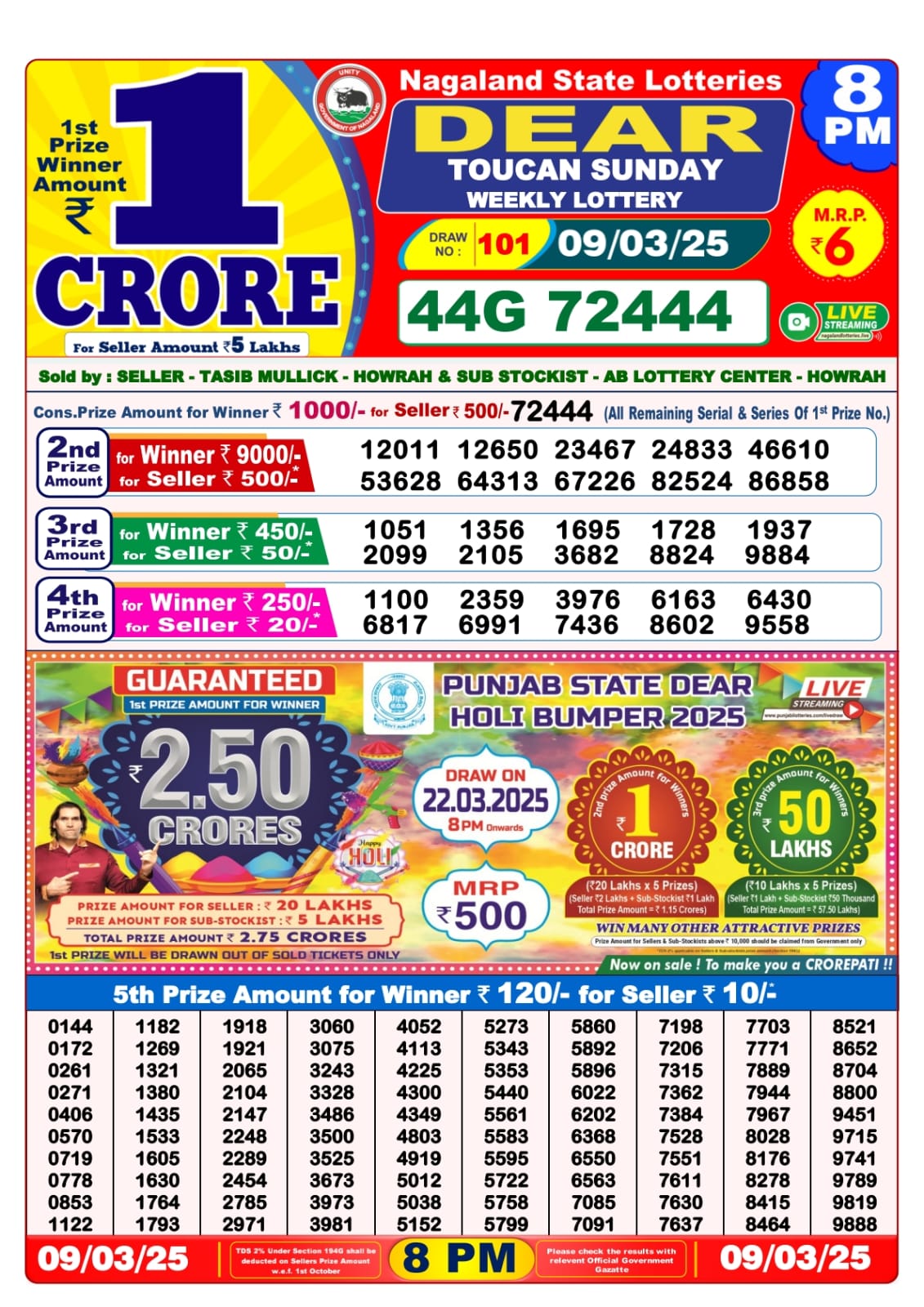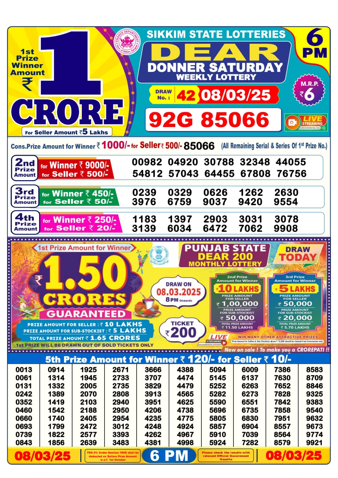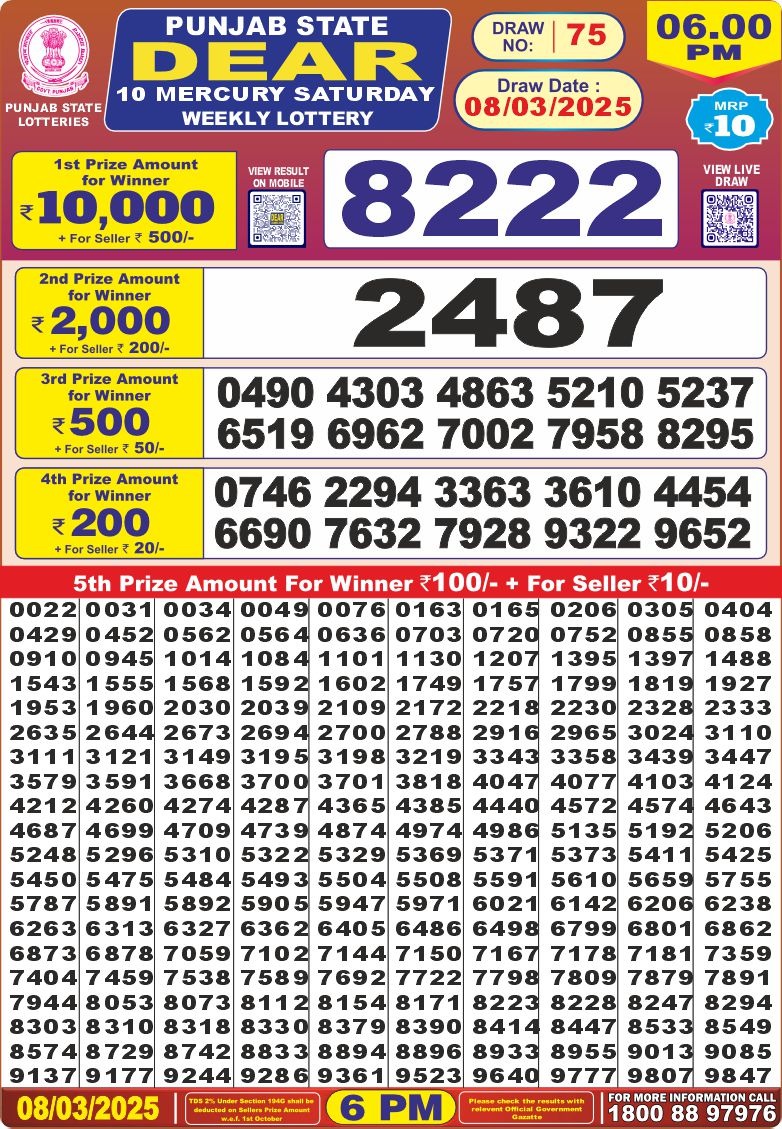 Punjab state dear 10 mercury Saturday weekly lottery 6 pm result 8-3-25