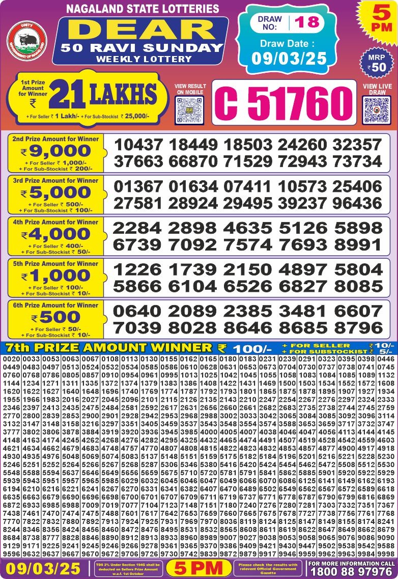 Dear 50 ravi sunday weekly lottery 5 pm result 9-3-25