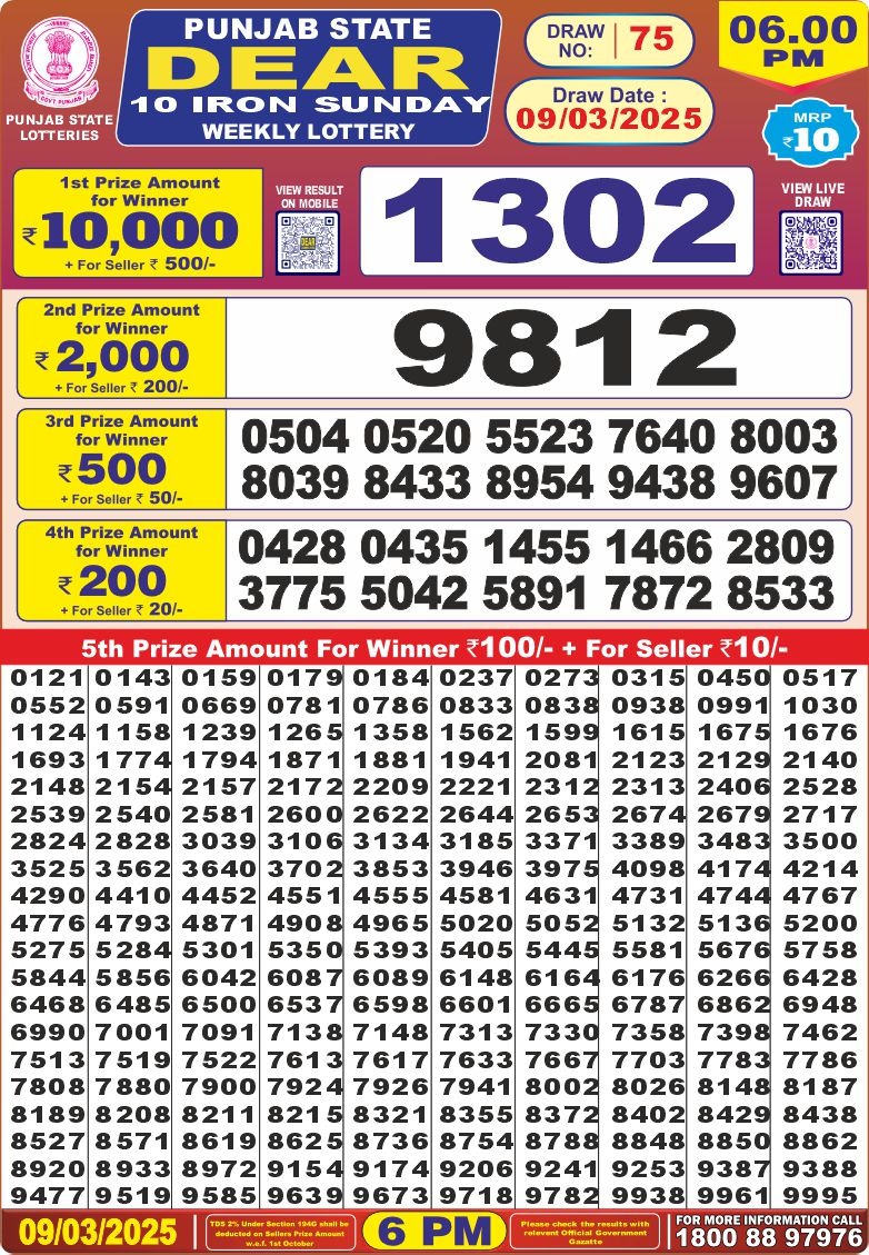 Punjab state dear 10 iron sunday weekly lottery 6 pm result 9-3-25