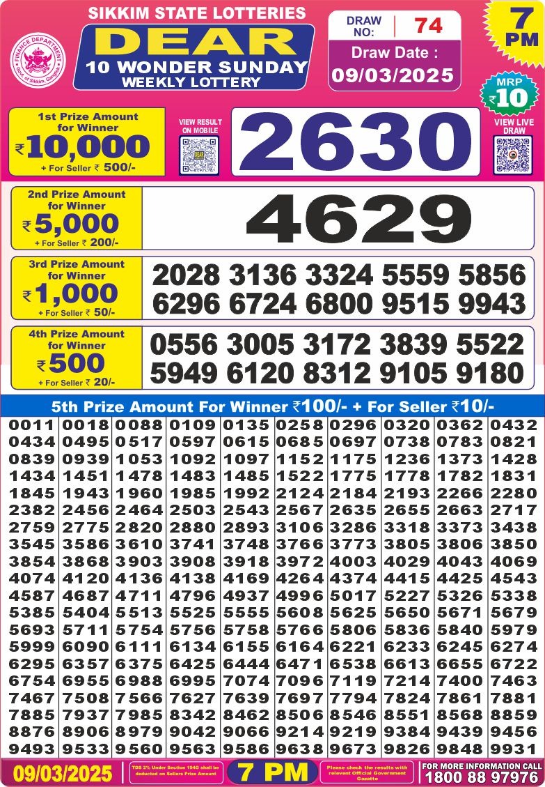 Dear 10 wonder sunday weekly lottery 7 pm result 9-3-25