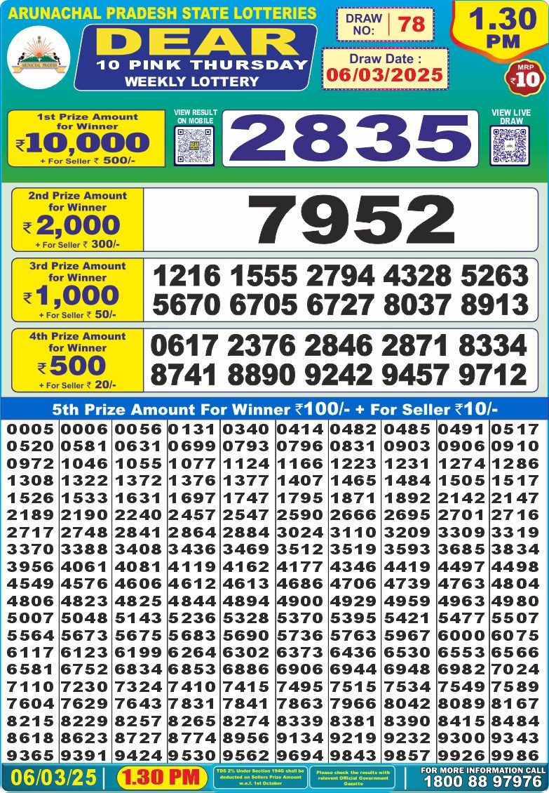 Dear 10 strong Thursday weekly lottery 7 pm result 6-3-25