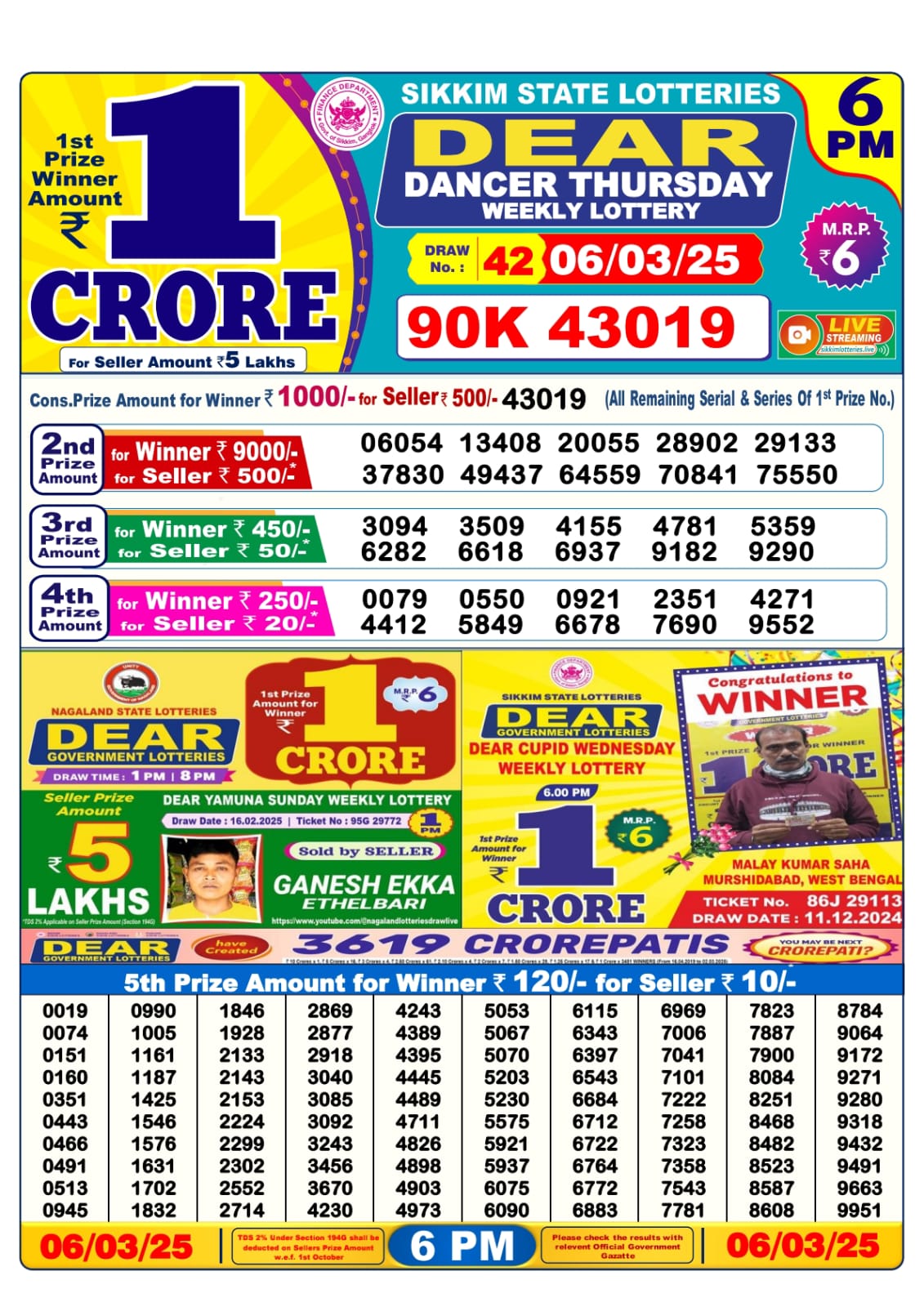Dear super platinum Thursday weekly lottery 7 pm result 6-3-25