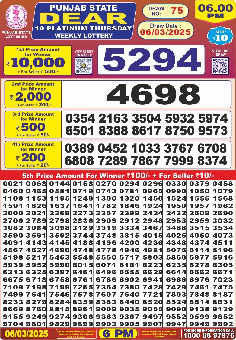 Punjab state dear 10 platinum Thursday weekly lottery 6 pm result 6-3-25