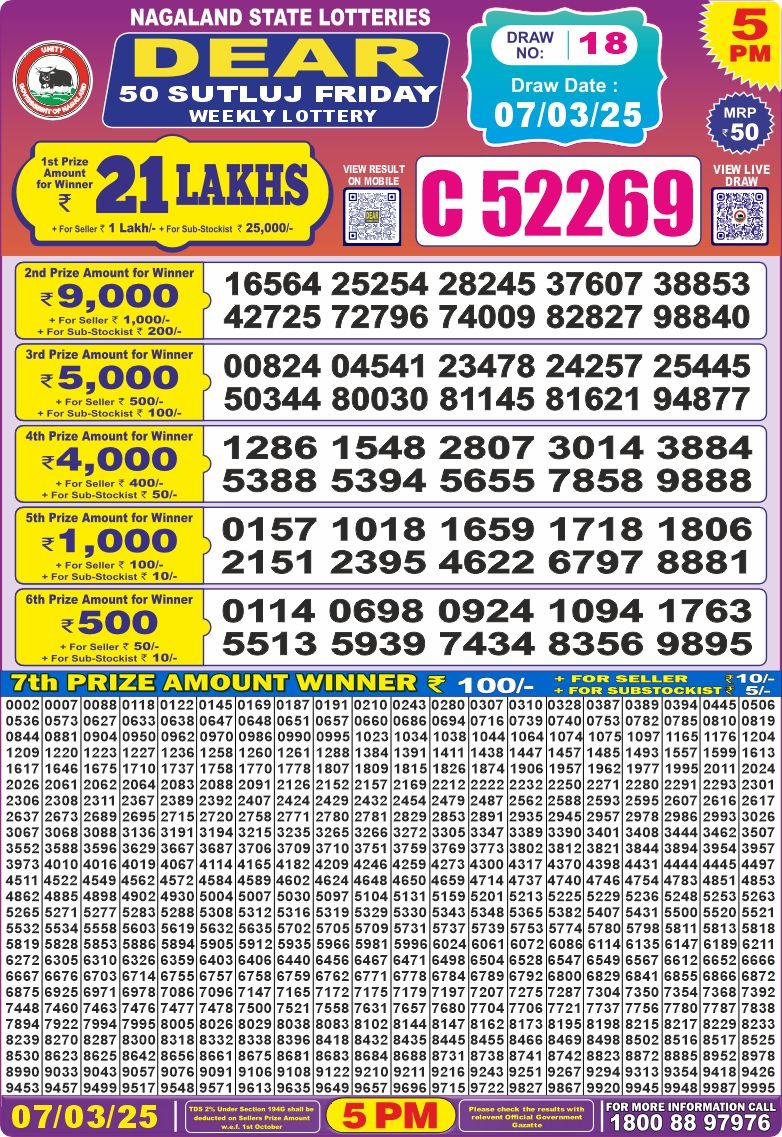Dear 50 sutluj friday weekly lottery 5 pm result 7-3-25