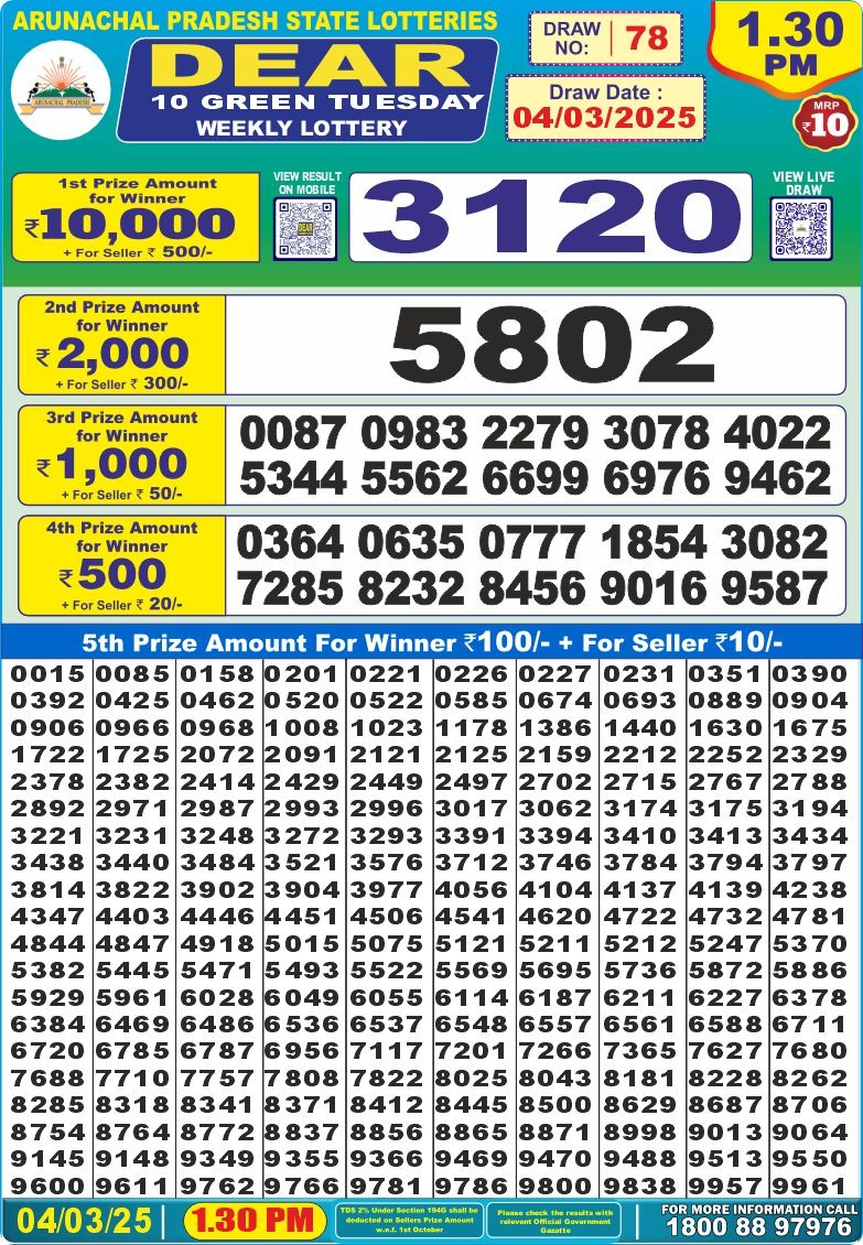 Dear 10 green tuesday weekly lottery 1:30 pm result 4-3-25