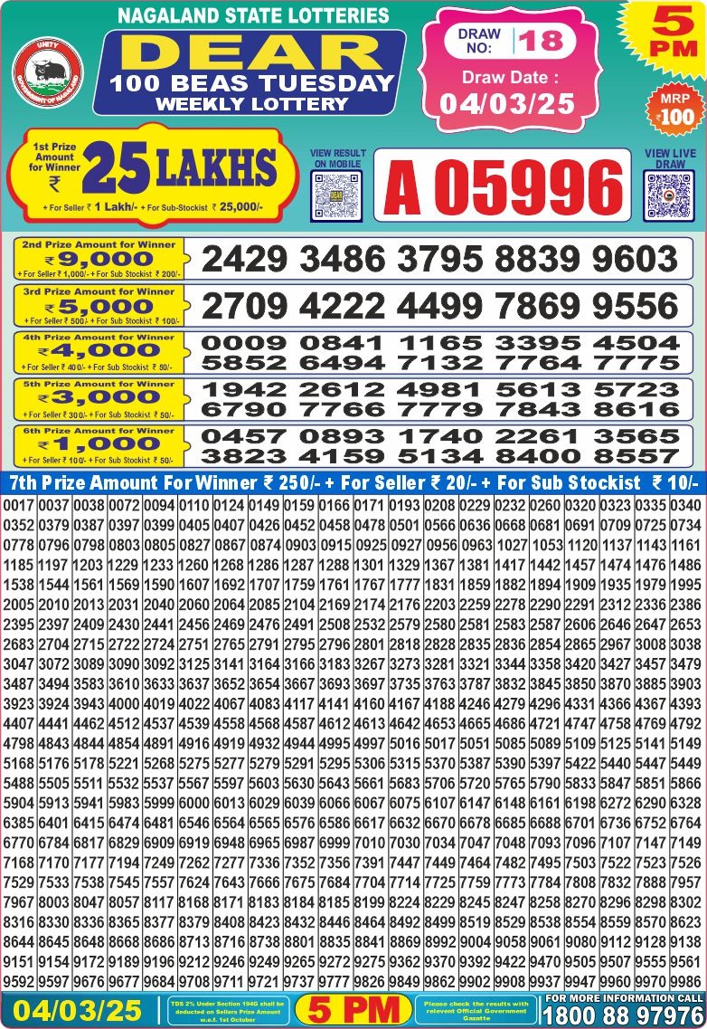Dear 100 beas tuesday weekly lottery 5 pm result 4-3-25