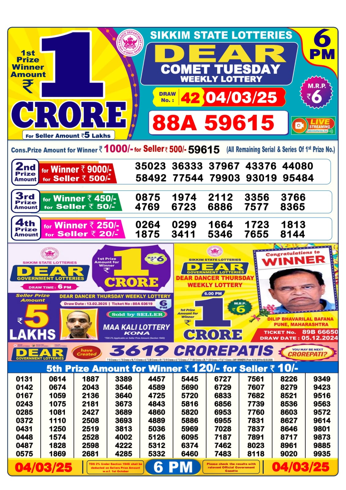 Dear comet tuesday weekly lottery 6 pm result 4-3-25