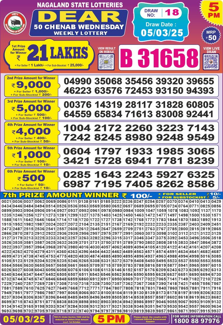 Dear 50 chenab Wednesday weekly lottery 5 pm result 5-3-25