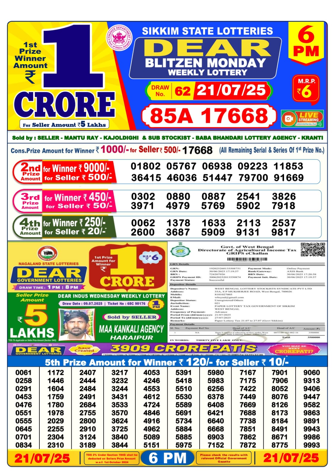 Dear blitzen monday weekly lottery 6 pm result 21-7-25