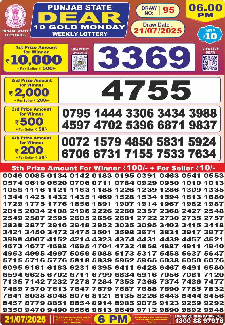 Punjab state dear 10 gold monday weekly lottery 21-7-25