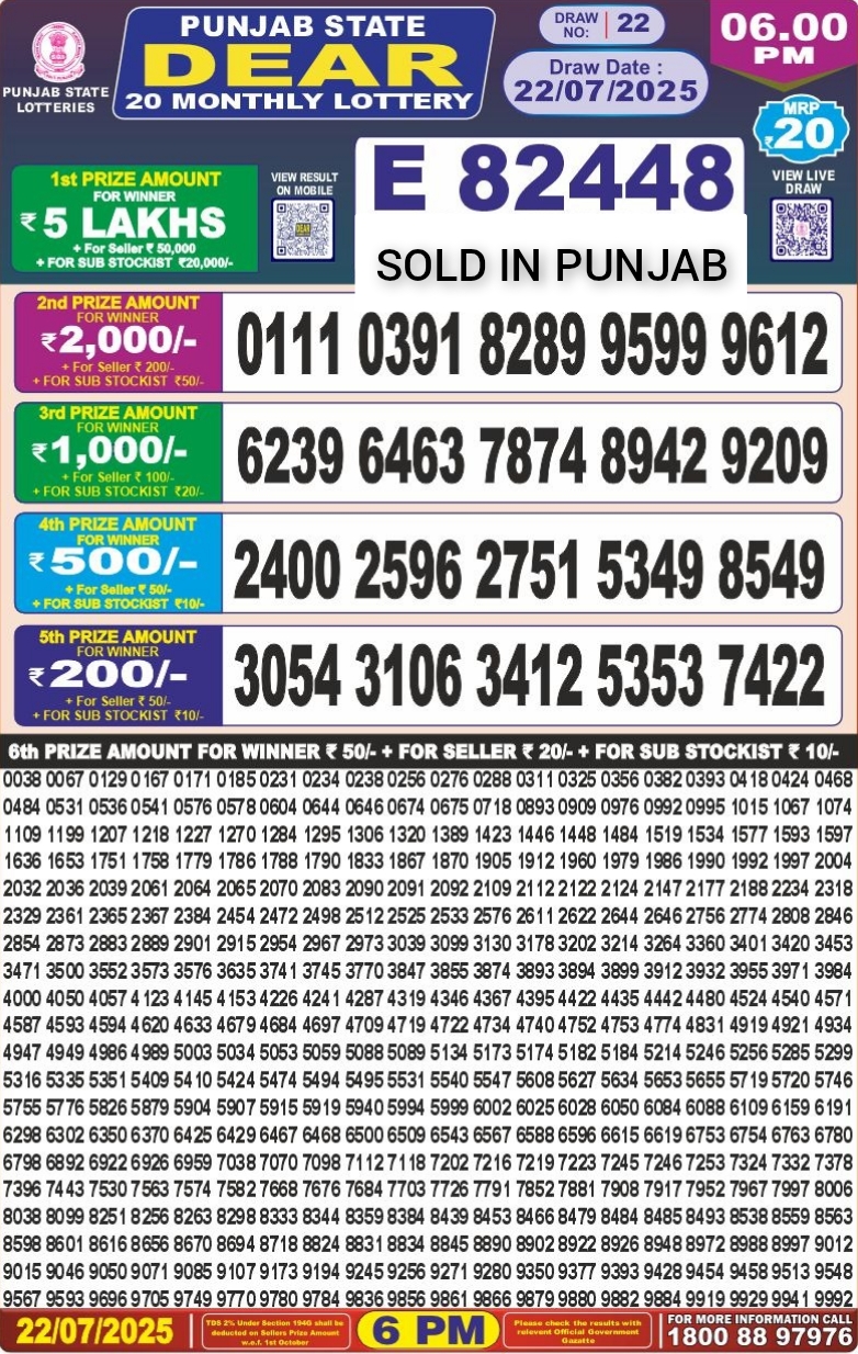 Punjab State Dear 20 monthly lottery result 22-7-25 6pm