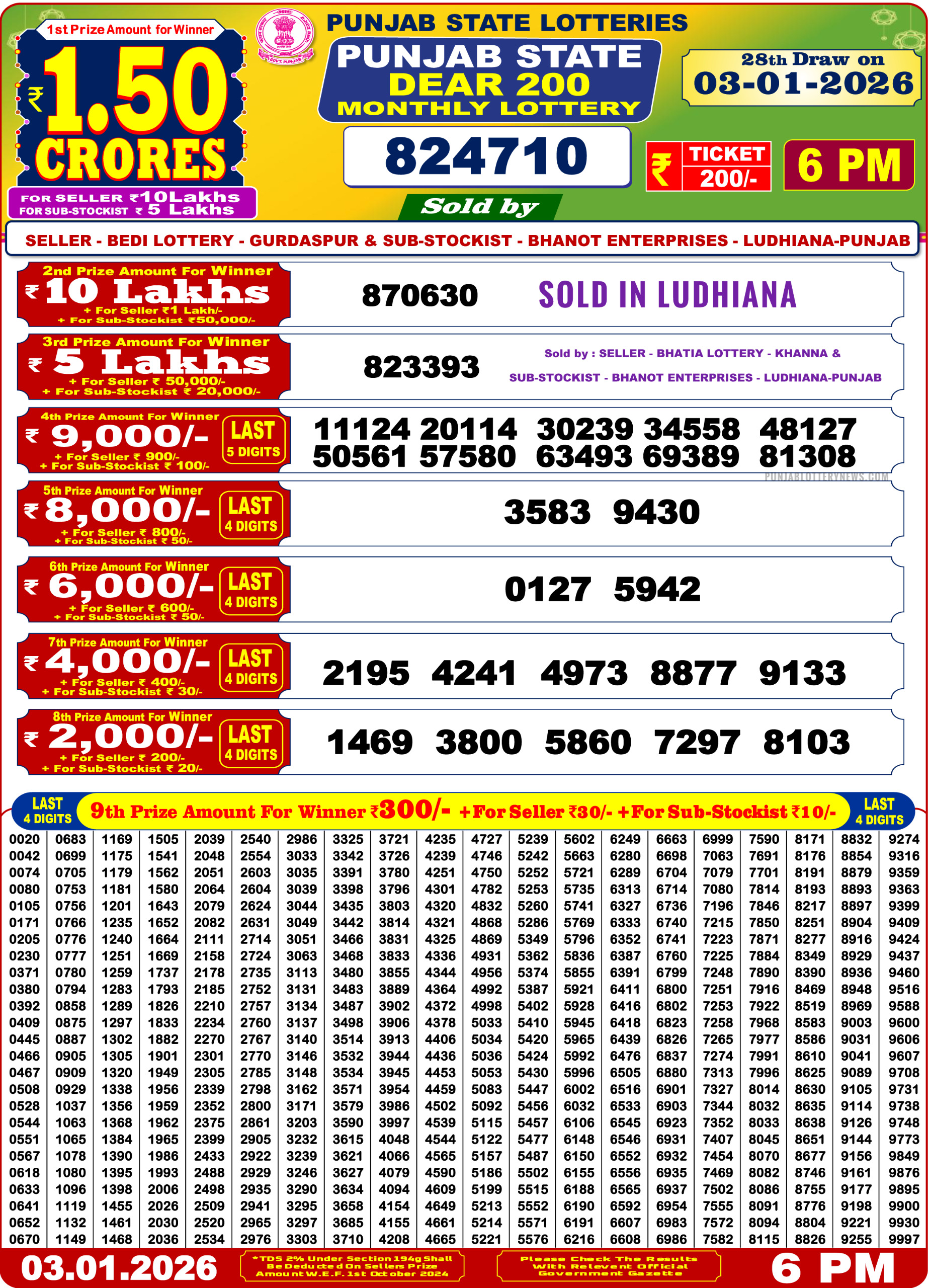 Punjab State Dear 200 Monthly Lottery 6pm Result 03-01-26