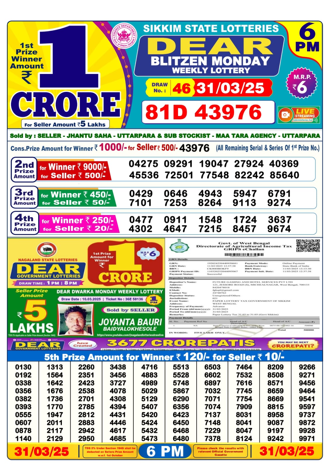 Dear super gold monday weekly lottery 7 pm result 31/3/25