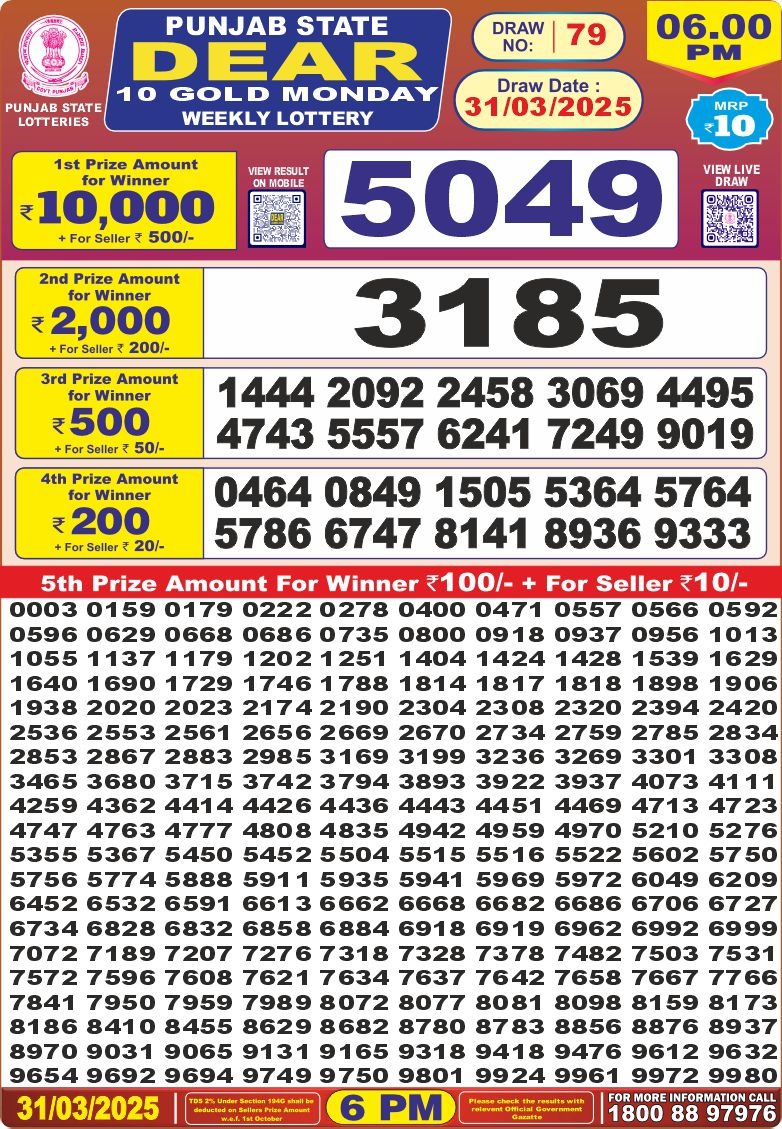 Punjab state dear 10 gold monday weekly lottery 31/3/25