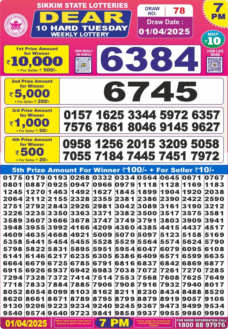 Dear 10 hard tuesday weekly lottery 7 pm result 1/4/25