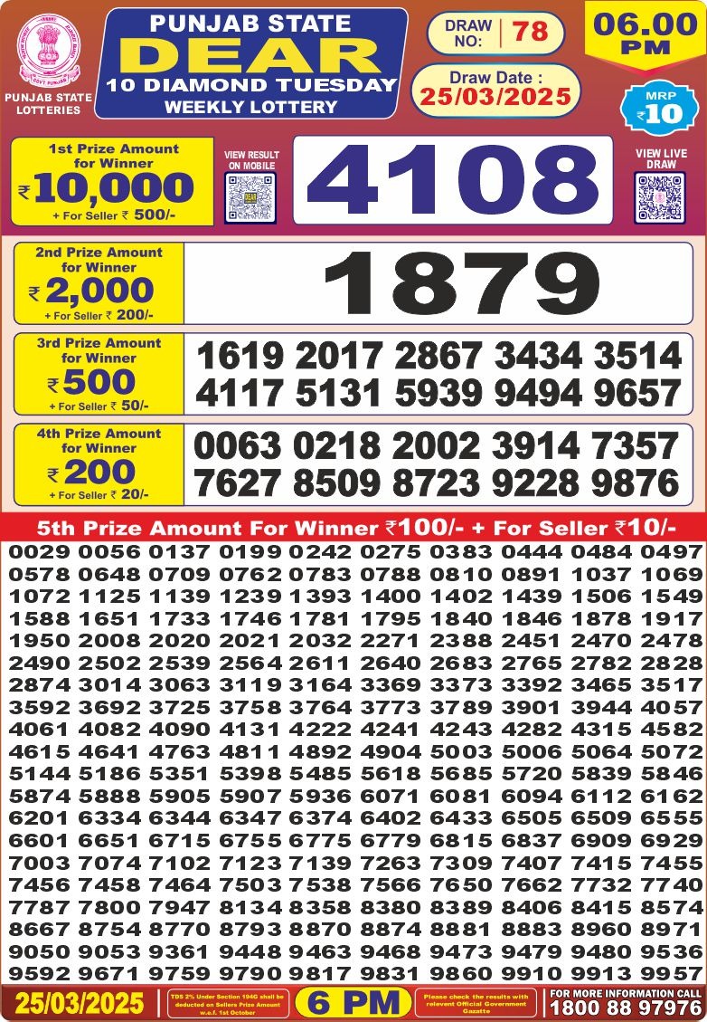 Punjab state dear 10 diamond 6 pm result 25-3-25