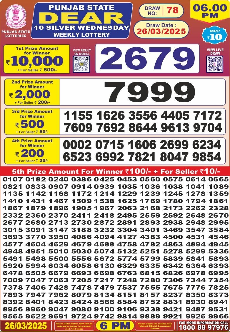 Punjab state dear 10 silver Wednesday weekly lottery 6 pm result 26-3-25