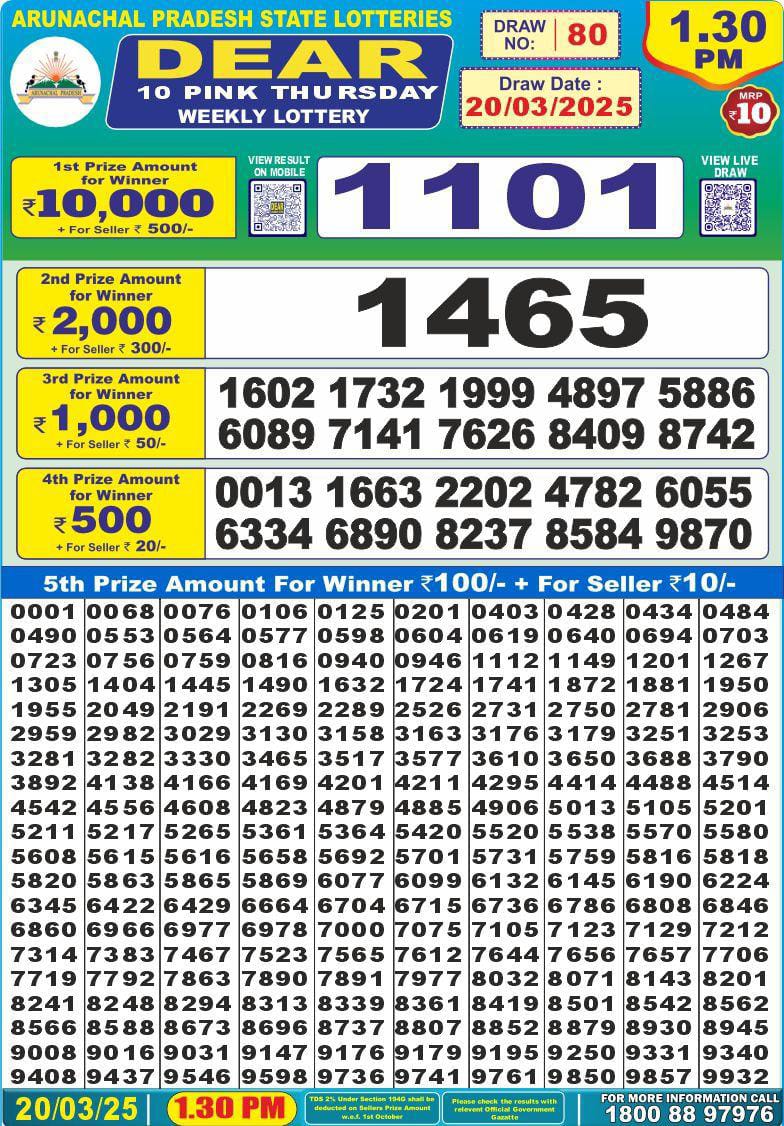 Dear 10 pink Thursday weekly lottery 1:30 pm result 20-3-25