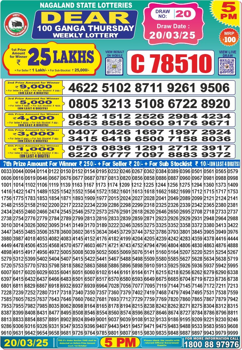 Dear 100 ganga Thursday weekly lottery 5 pm result 20-3-25