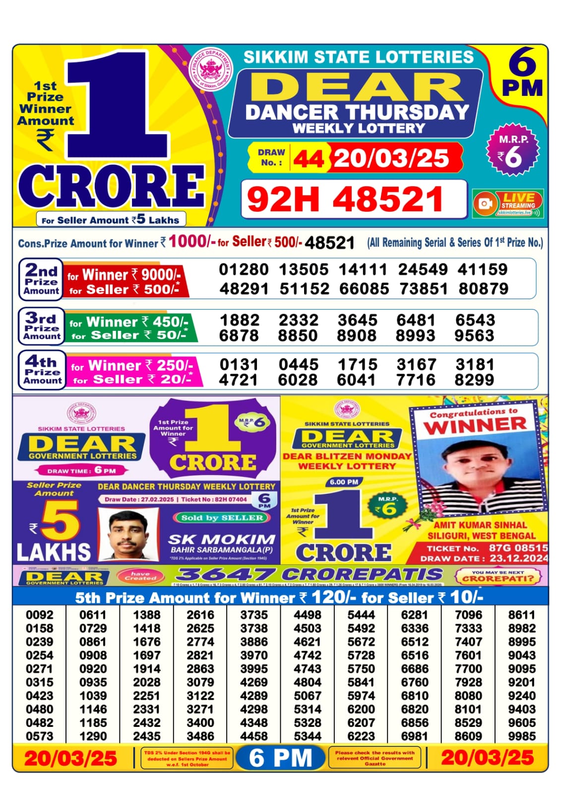 Dear dancer Thursday weekly lottery 6 pm result 20-3-25