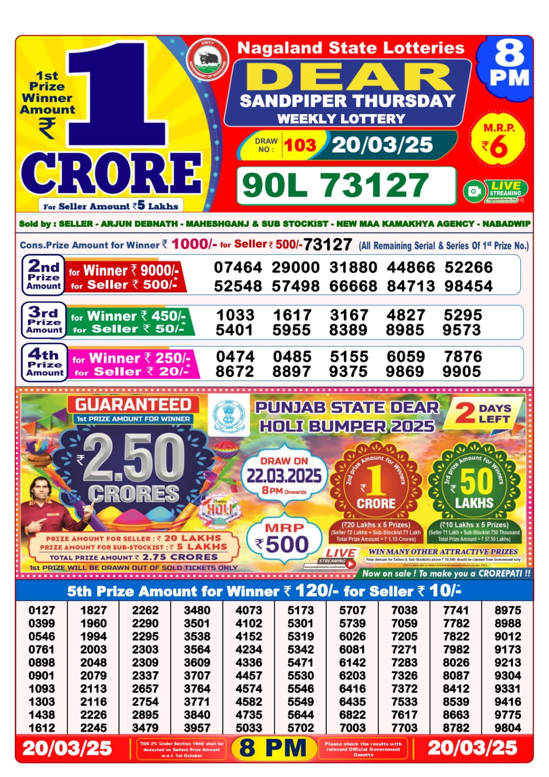 Dear 10 strong Thursday weekly lottery 7 pm result 20-3-25