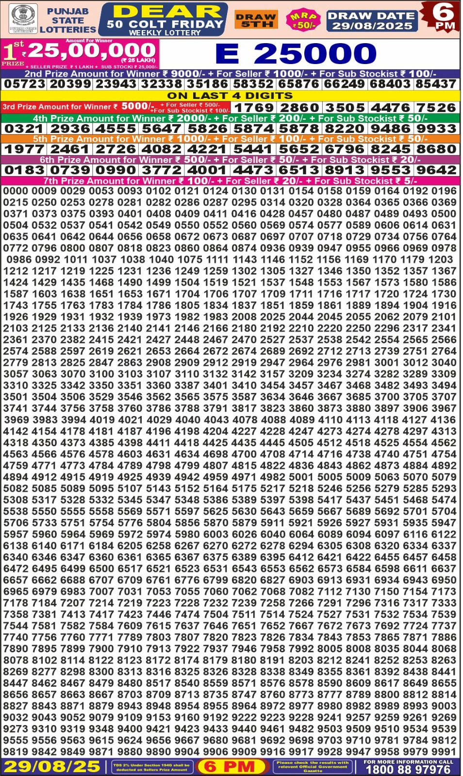 Punjab State Dear 50 colt Friday Weekly Lottery 6 PM Result 29-08-25