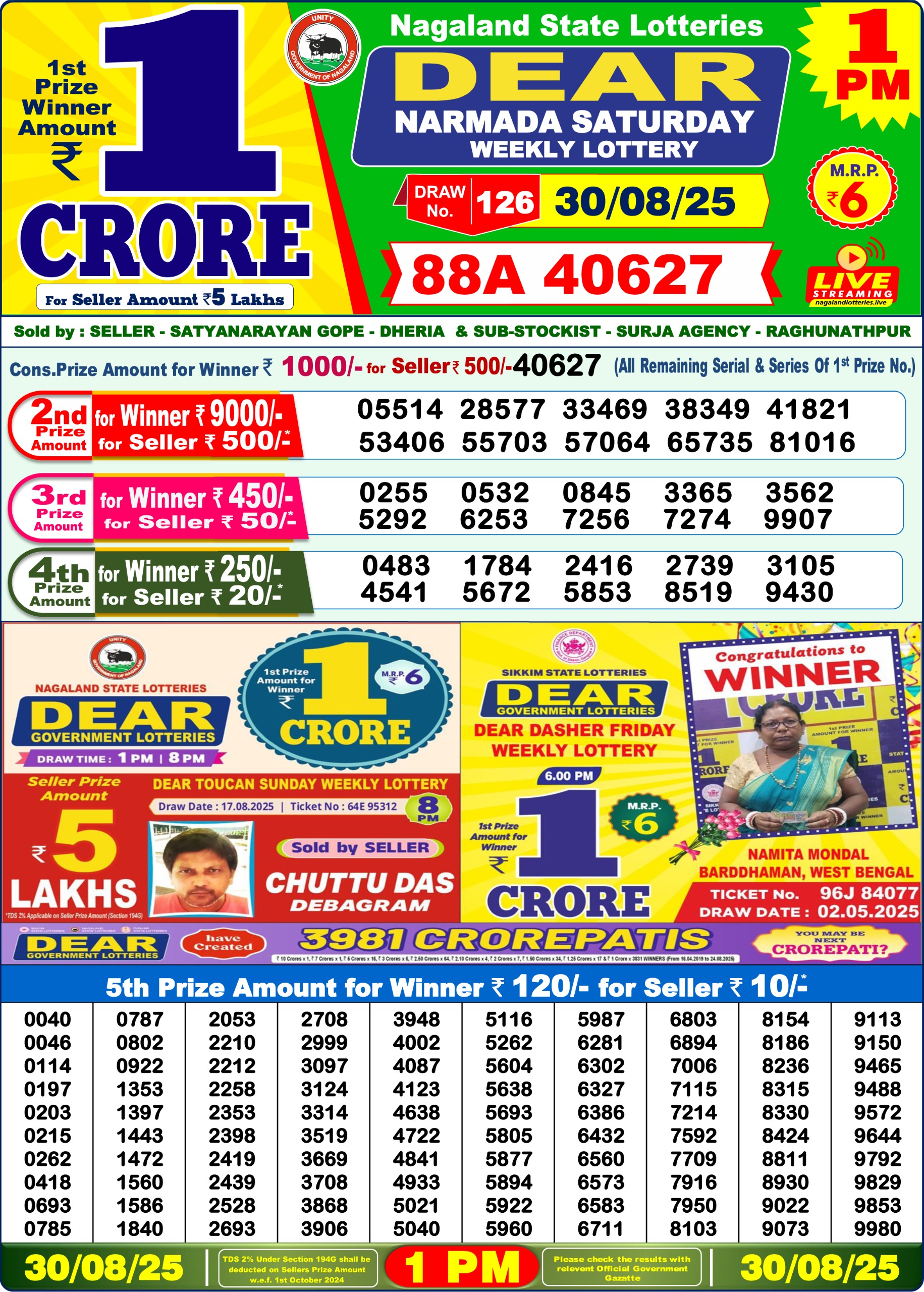Dear Narmada Saturday Weekly Lottery 1 PM Result 30-08-25