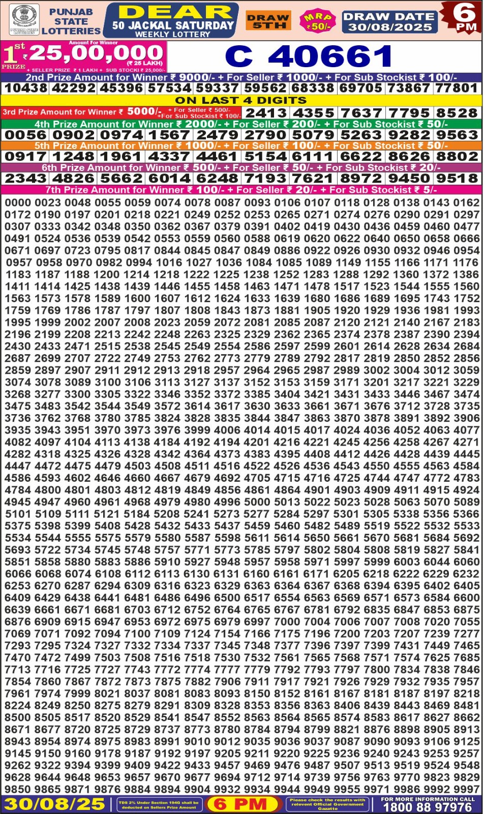 Punjab State Dear 50 Jackal Saturday Weekly Lottery 6 PM Result 30-08-25
