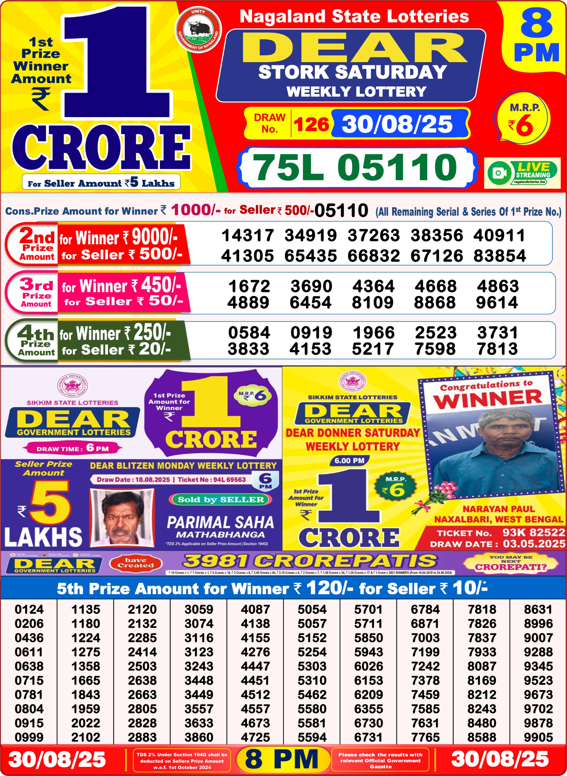 Dear Donner Saturday Weekly Lottery 6 PM Result 30-08-25