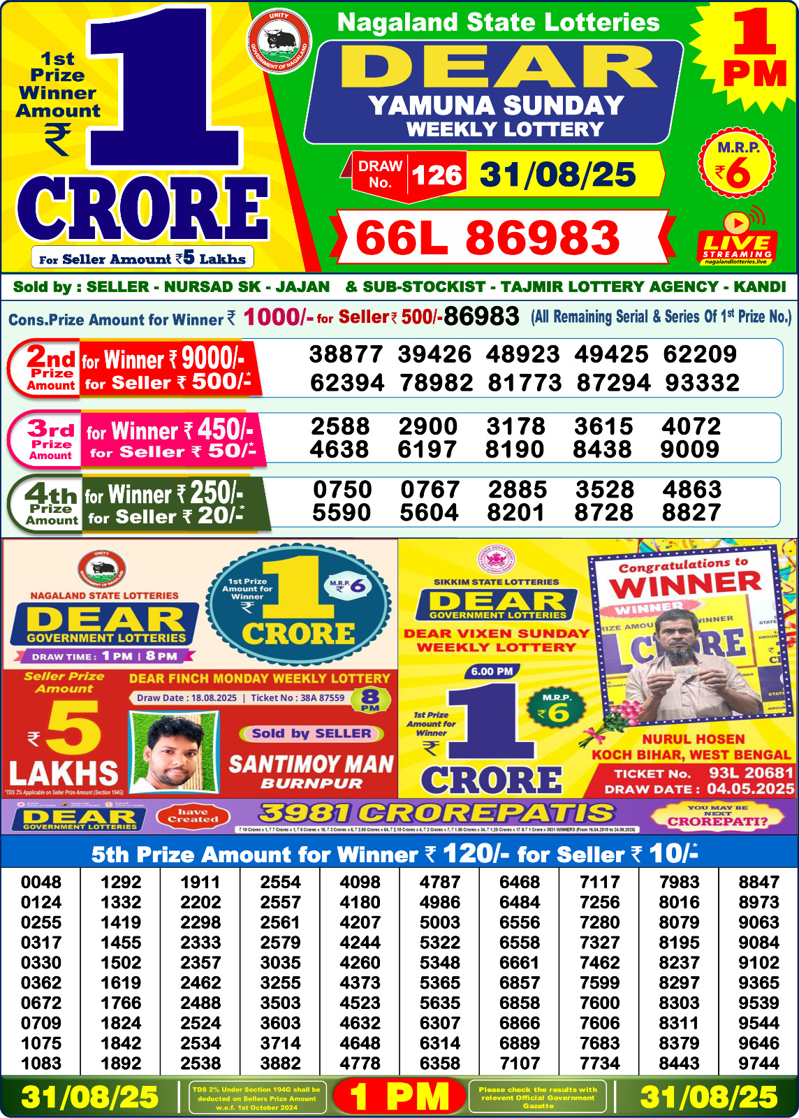 Dear Yamuna Sunday Weekly Lottery 1 PM Result 31-08-25