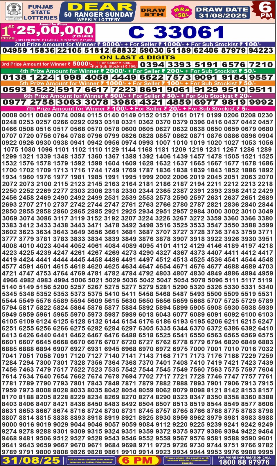 Punjab State Dear 50 Ranger Sunday Weekly Lottery 6 PM Result 31-08-25