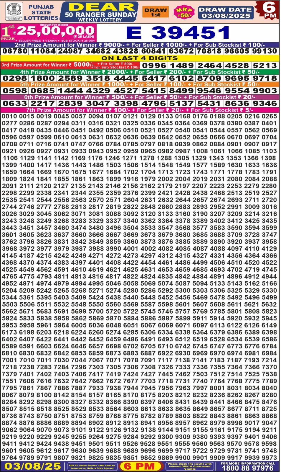Punjab State Dear 50 Ranger Sunday Weekly Lottery 6 PM Result 03-08-25