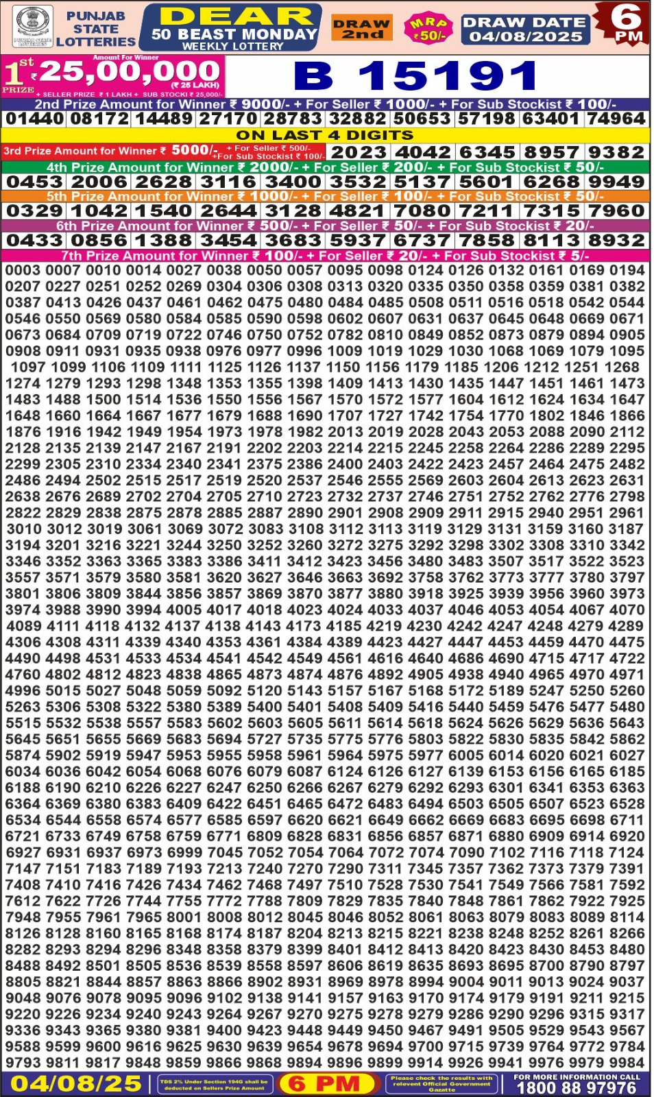 Punjab State Dear 50 Beast Monday Weekly Lottery 04-08-25