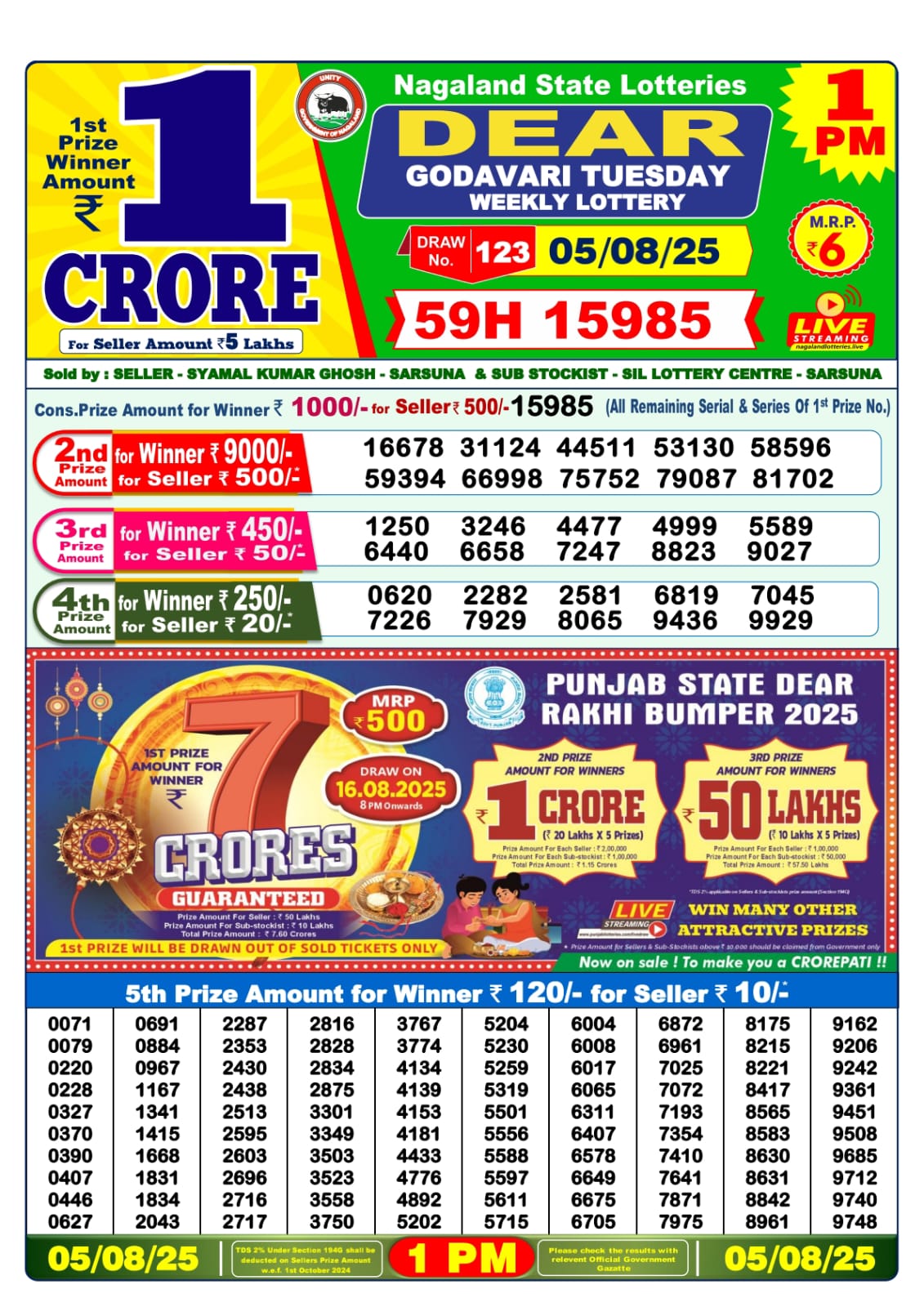 Dear Godavari Tuesday Weekly Lottery 1 PM Result 05-08-25