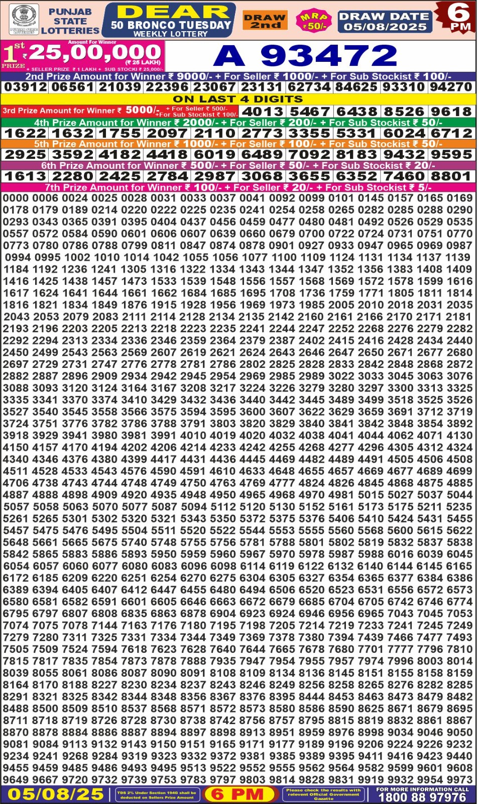 Punjab State Dear 50 Bronco 6 PM Result 05-08-25